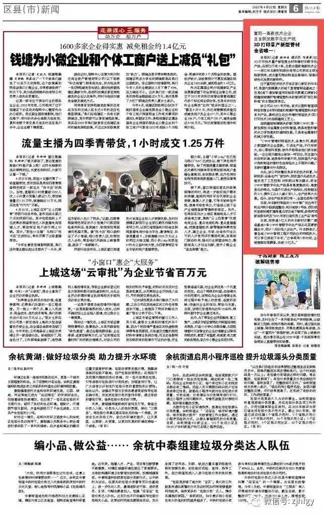 4月22日,杭州日?qǐng)?bào)以“富陽(yáng)一高新技術(shù)企業(yè) 自主研發(fā)數(shù)字化生產(chǎn)線”為題,報(bào)道我公司智能化、數(shù)字化、高端化的連續(xù)纏繞玻璃鋼夾砂管(簡(jiǎn)稱CWFP)3D打印技術(shù)生產(chǎn)線。